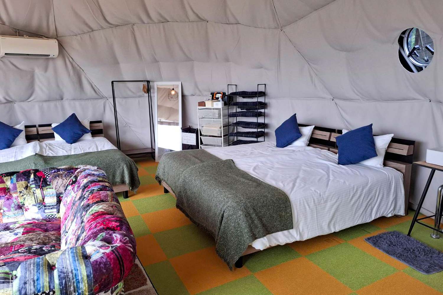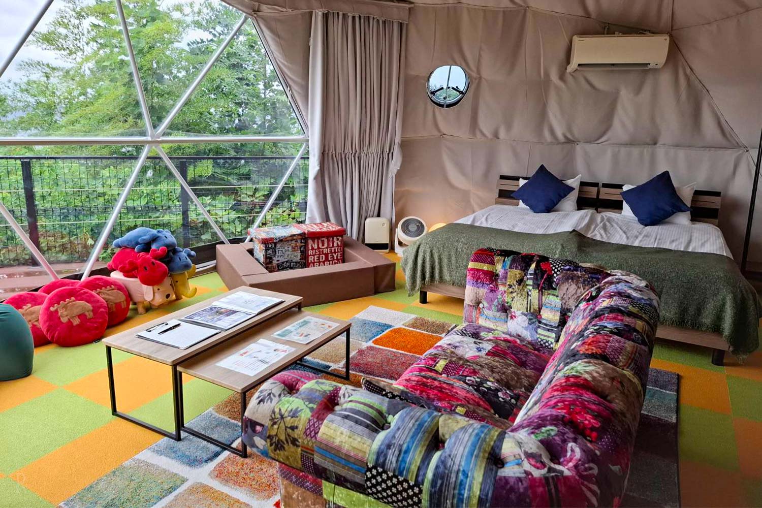 直径8mのドームテント。客室面積50㎡の大空間は冷暖房完備でオールシーズン快適にお過ごし頂けます。