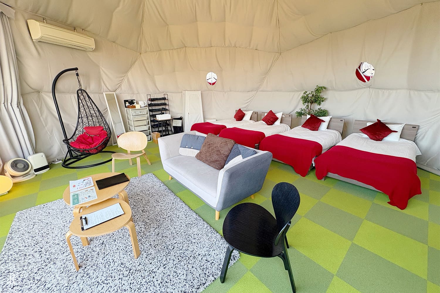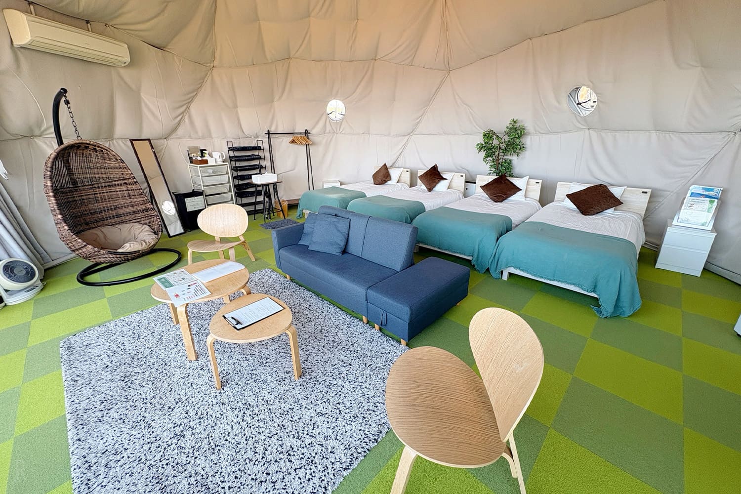 ドームテント内はシングルベットを8台設置とグループでの利用はもちろん、3世代での家族旅行も利用可能な大空間が広がっております。